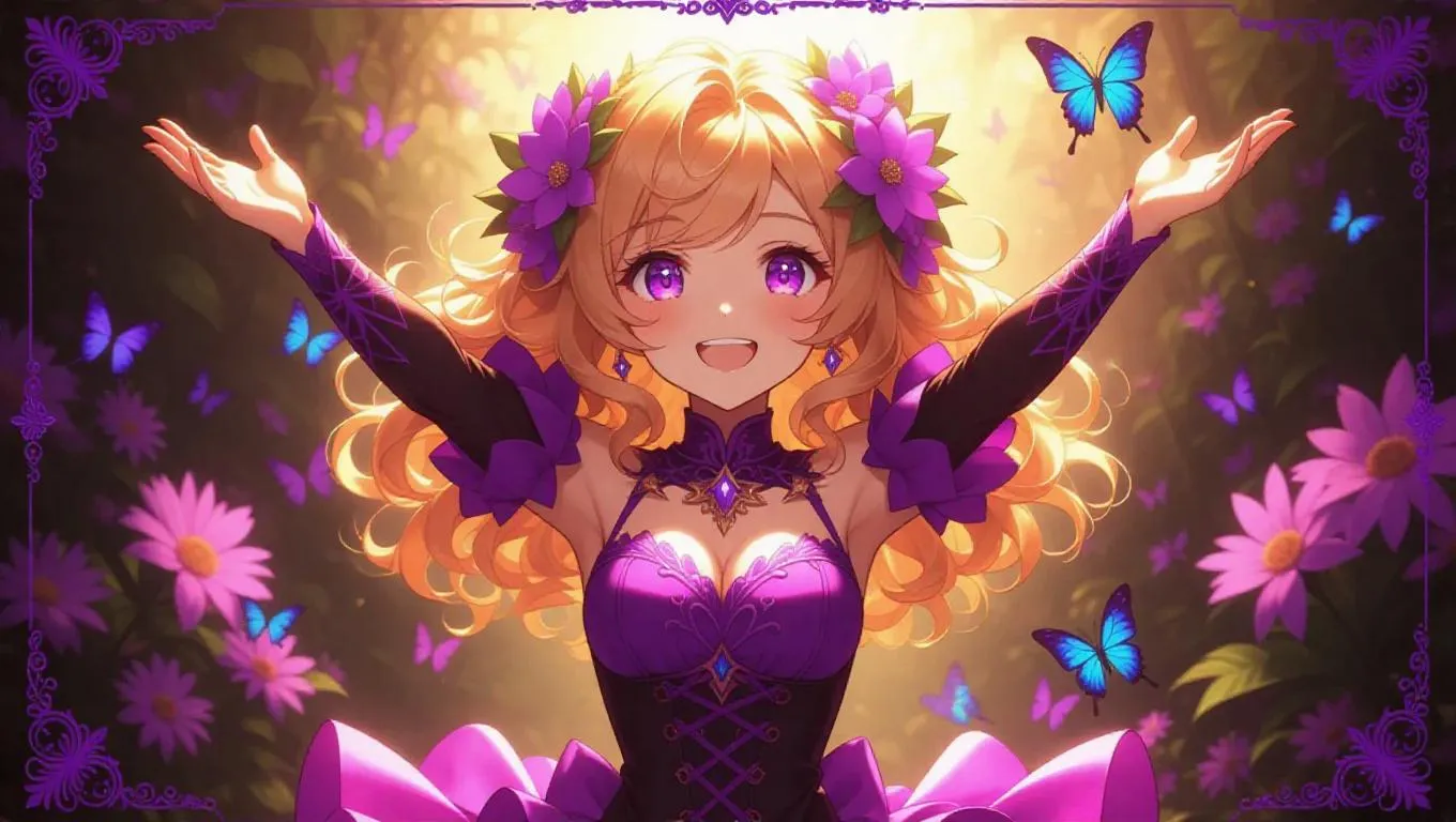 An energetic anime-style female druid, adorned in a purple and pink outfit with intricate flower patterns, stands with her arms raised. Her curly blonde hair is entwined with bright blossoms, and her lavender eyes radiate joy. The background showcases a vibrant garden with luminescent butterflies. The scene is framed by an ornate purple border with floral motifs and a subtle glimmer.
