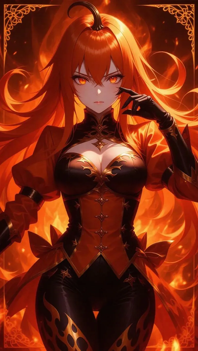 A fierce anime-style female sorceress, clad in a flamboyant orange and black outfit adorned with intricate flame-like patterns, strikes a commanding pose. Her long pumpkin hair cascades like liquid fire, and her glowing red-orange eyes blaze with intense determination. The background is a swirling inferno with radiant embers, framed by a fiery red border with holographic flame motifs.