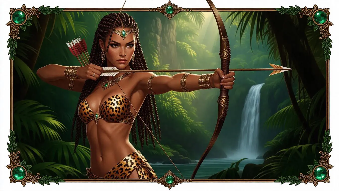 A fierce huntress with intricately braided hair, wearing a daring leopard-print bikini and a flowing sarong. She holds a taut bow and arrow, poised for action, while standing in a dense, verdant jungle. Towering trees and cascading waterfalls frame the scene. The card border integrates animal print and vine motifs, accented with lush green and shimmering gold decorations, and adorned with gleaming emeralds.