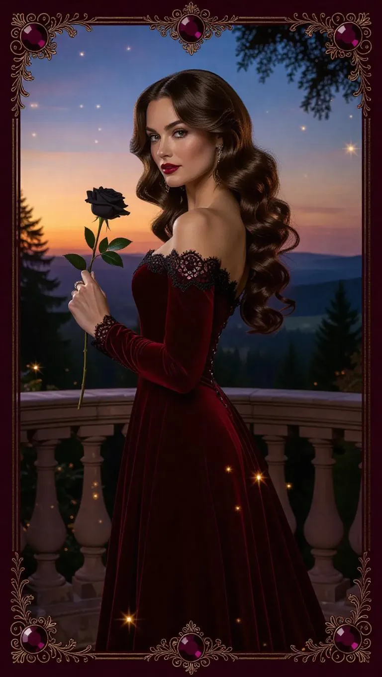 A mysterious queen with wavy mahogany hair, wearing a luxurious velvet gown with lace trim, holds a black rose while standing on an embellished balcony overlooking a clear dusk sky. The background showcases a tranquil, enchanted forest with flickering fireflies. The card border features rich floral and star motifs, accented with deep burgundy and silver decorations, and adorned with sparkling garnets.