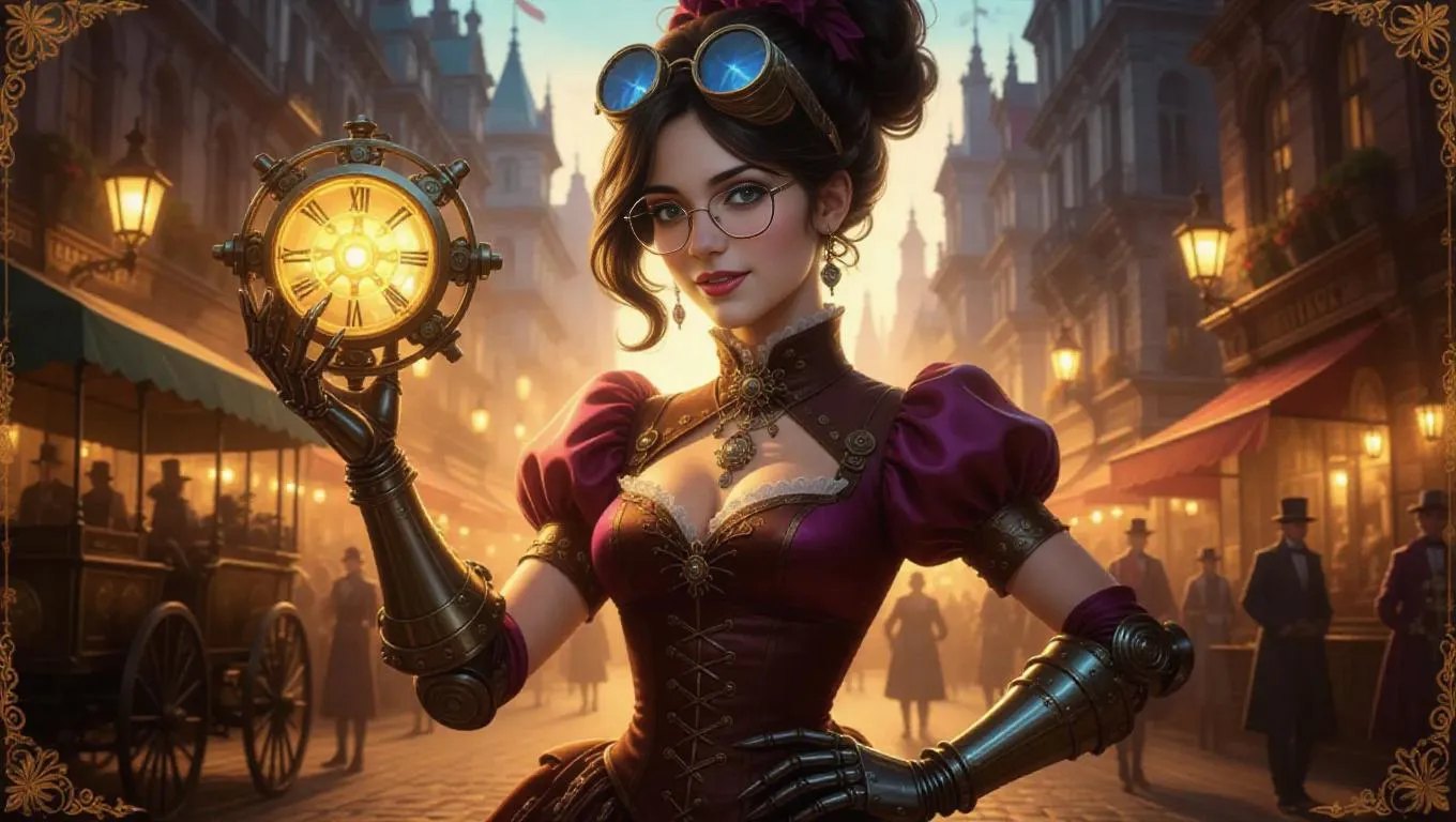A steampunk inventor girl with a mechanical arm and fashion goggles holds a glowing gear-powered device. She stands in front of a bustling city street filled with carriages and pedestrians. The scene is framed with textile-themed borders and fabric patterns, bathed in a vibrant city glow. Detailed mechanical textures and fashion magazine design elements enhance the dynamic atmosphere. Bright, cheerful side light highlights her confident pose and the intricate gears, creating a lively yet fashionable feel.