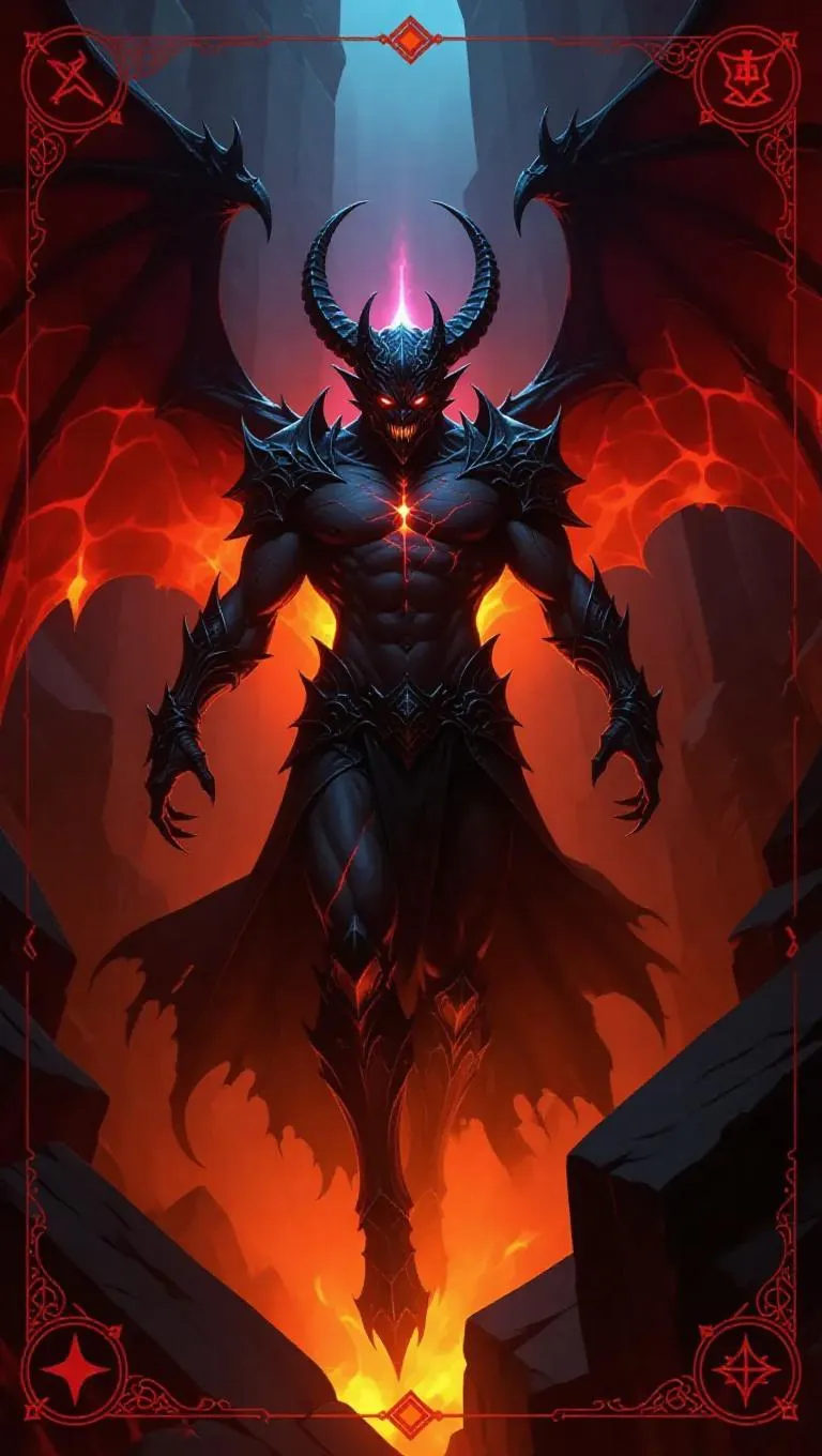 A shadowy demon lord rises from an underworld chasm, his colossal wings extending, molten bronze horns glowing fiercely, and radiant scarlet cracks crisscrossing his muscular body. Hellfire and despair envelop him, with malevolent sigils and a thick midnight border adorned with luminous lava cracks framing the scene. An ancient relic card emblem in the corner boosts the supernatural vibe. Dramatic lighting and deep shadows enrich the game card imagery.