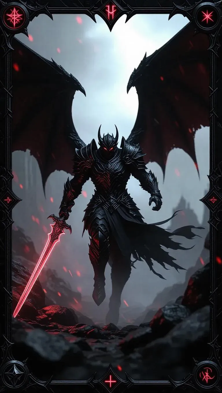 A fierce demon warrior ascends from the ground, wings curled tightly, and a sword pulsating with dark energy. His black armor absorbs shadows, and the background reveals a chaotic wasteland. The game card features a dark-themed border with jagged runes, silver foil textures, and an ominous dark glow.