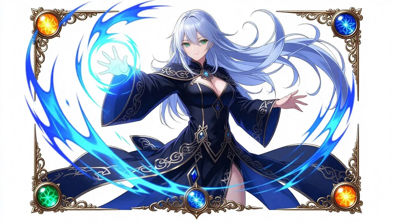 A stunning anime-style female mage, dressed in a sleek robe adorned with storm symbols, stands in a dynamic pose, casting a spell. Her long silver hair glows with a faint electric blue light, and her piercing green eyes radiate energy. Swirling water, fire, and wind elements surround her, with glowing runes crackling in the air. The card border is ornate, with intricate bronze filigree, embedded citrines, and holographic shimmer, framed by swirling elemental motifs.