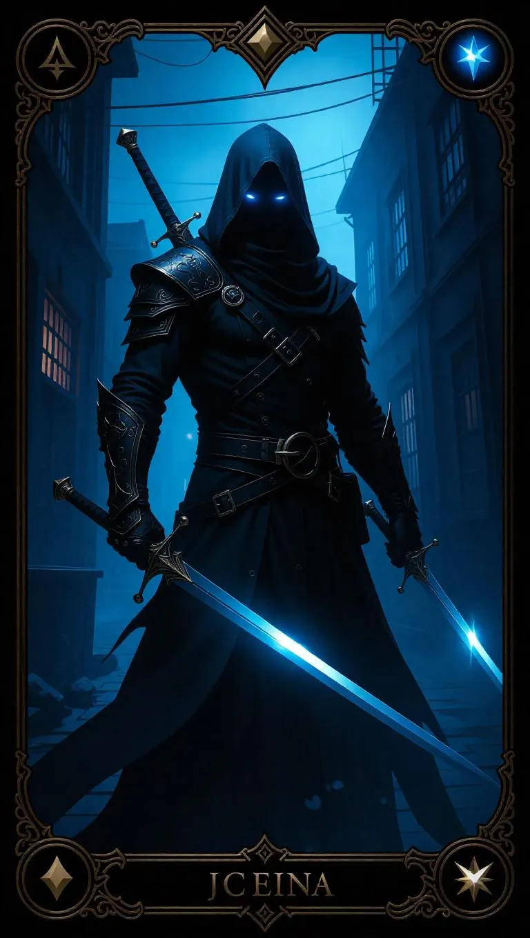 A mysterious cloaked figure stands shrouded in shadow mist, holding twin blades of darkness. His glowing blue eyes pierce through the night. Abandoned warehouses and lurking phantoms form the background. The scene is bathed in cold, flickering light, enhancing the eerie atmosphere. The card features stealth-themed gold-on-black accents with razor-sharp borders, adding a sharp, menacing edge. Style: Dark fantasy.