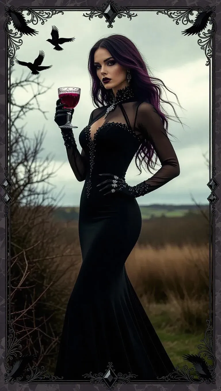 A seductive vampire with deep purple lips, wearing a sleek black dress with a long train, holds a jeweled goblet of blood. Standing in a desolate moor under a cloudy sky, surrounded by gnarled trees and howling wind. The card border integrates crow and thistle motifs, accented with gray and green decorations, and adorned with shimmering black diamonds.
