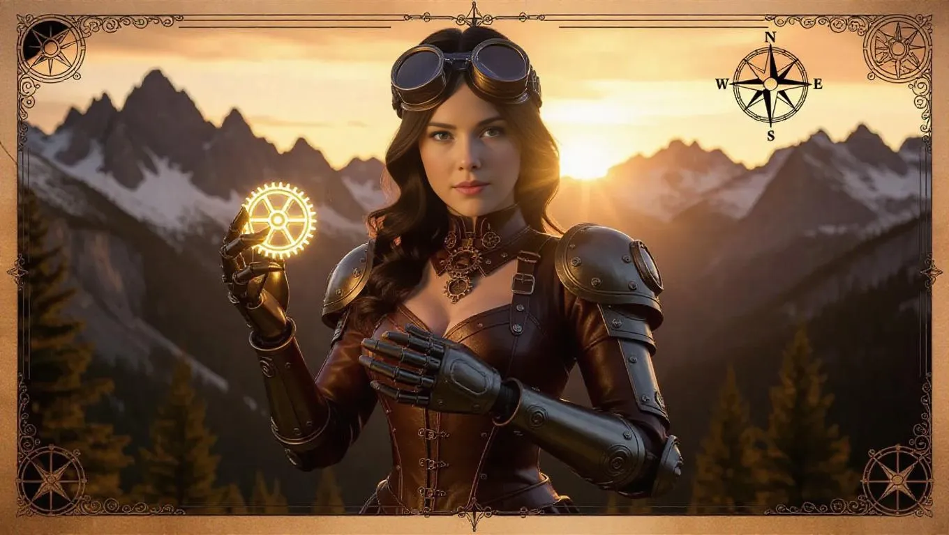 A steampunk inventor girl with a mechanical arm and pilot goggles holds a glowing gear-powered device. She stands in front of a mountain range filled with cliffs and valleys. The scene is framed with stone-themed borders and compass designs, bathed in a dramatic sunrise glow. Detailed mechanical textures and explorer journal design elements enhance the rugged atmosphere. Soft, orange side light highlights her daring spirit and the intricate gears, creating an adventurous yet tranquil feel.