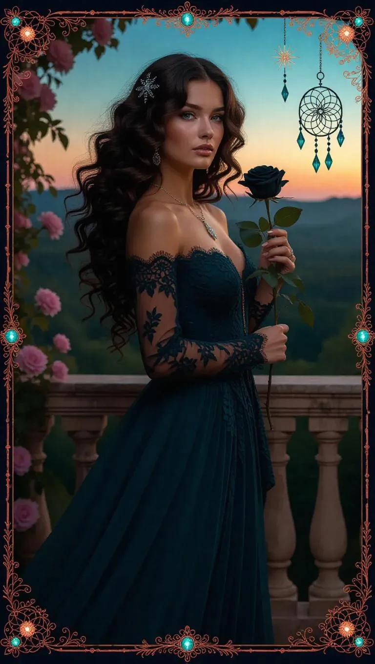 A mysterious queen with flowing curly hair in shades of teal, wearing a bohemian gown with lace overlay, holds a black rose while standing on an antique balcony overlooking an early evening sky. The background showcases a thick, enchanted forest with softly glowing flowers. The card border features whimsical dreamcatcher and star motifs, accented with coral and teal decorations, and adorned with sparkling moonstones.