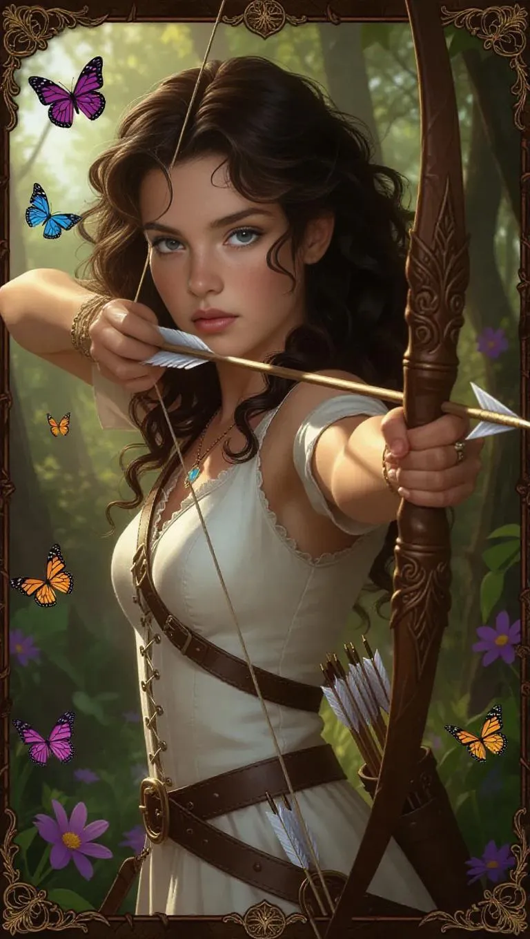A youthful female archer with curly dark brown hair and sharp, focused gray eyes, clad in an elegant white outfit with a quiver of arrows and a delicate bow. She takes aim, and a magical arrow with a glowing tip is poised for release. The dense woodland background features blooming flowers and fluttering butterflies, framed by a rustic wooden border adorned with fairy tale patterns and hunting insignias, exuding a natural, earthy texture. Soft lighting, subtle glows, and a sense of adventure create a captivating collectible card game-style image.