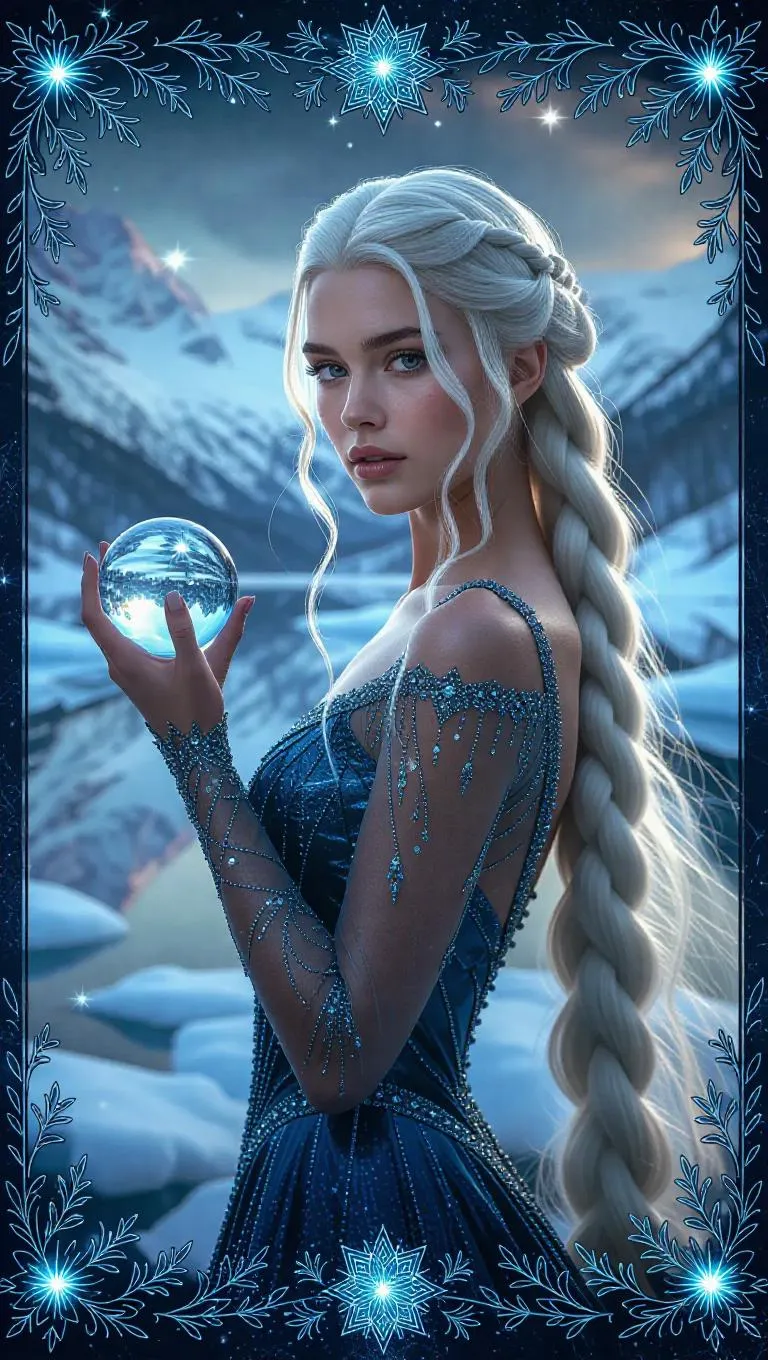 A regal ice queen with plaited ashy hair, adorned in a glimmering gown that twinkles like sunlight on ice. She holds a frosty orb, standing majestically on a frozen ocean. Icy fjords and a canopy of stars create a magical backdrop. The card border features intricate leaf and snow designs, accented with aqua and silver, and embellished with flawless crystals.