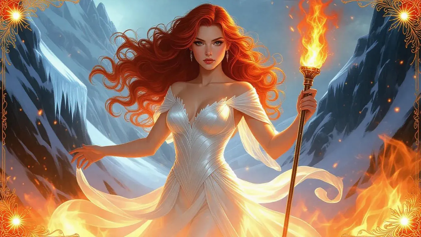 A fiery goddess with ruby-red tresses, wearing a molten white gown that gleams like ice. She holds a blazing torch while standing amidst roaring flames. The background showcases an icy landscape with frozen fire. The card border integrates intricate flame and sunburst motifs, accented with pale white and vibrant red decorations, and adorned with radiant ice crystal.