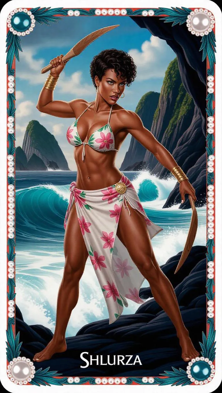 A fierce huntress with short curly hair, wearing a chic floral bikini and a sarong. She holds a boomerang, ready for action, while standing on a rocky shoreline. Dramatic cliffs and crashing waves frame the scene. The card border showcases oceanic motifs and wave patterns, accented with turquoise and coral red decorations, and adorned with sparkling pearls.