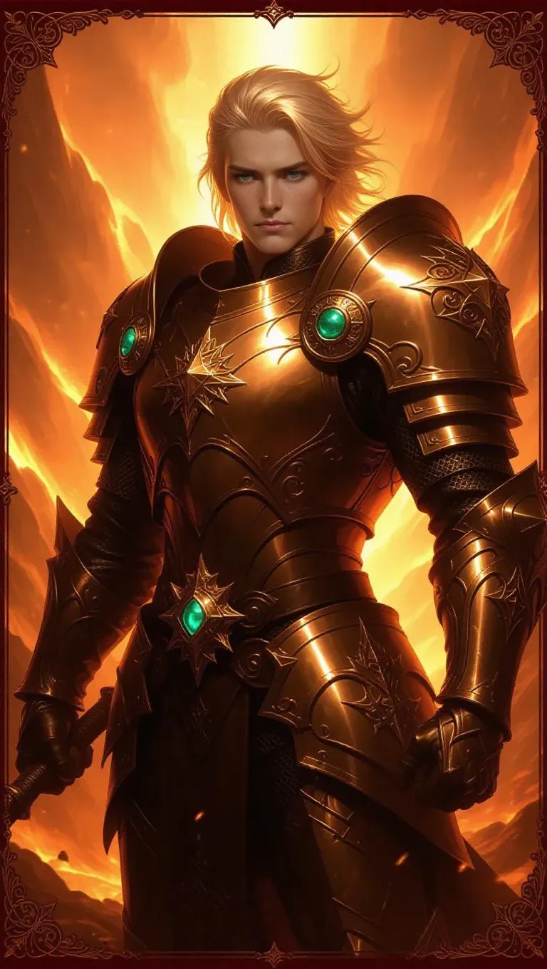 A noble male paladin with sleek golden hair and determined, compassionate jade eyes, wearing shining copper armor adorned with celestial symbols and a powerful hammer. He stands valiantly, surrounded by a fierce aura and radiant beams of light. The background is a volcanic landscape with flowing lava and ash clouds, framed by a fiery red border with elemental motifs and ancient symbols, featuring a shimmering, molten texture. Bright lighting, amber glows, and an intense, fiery atmosphere, presented as a glorious masterpiece in the style of action-adventure games.