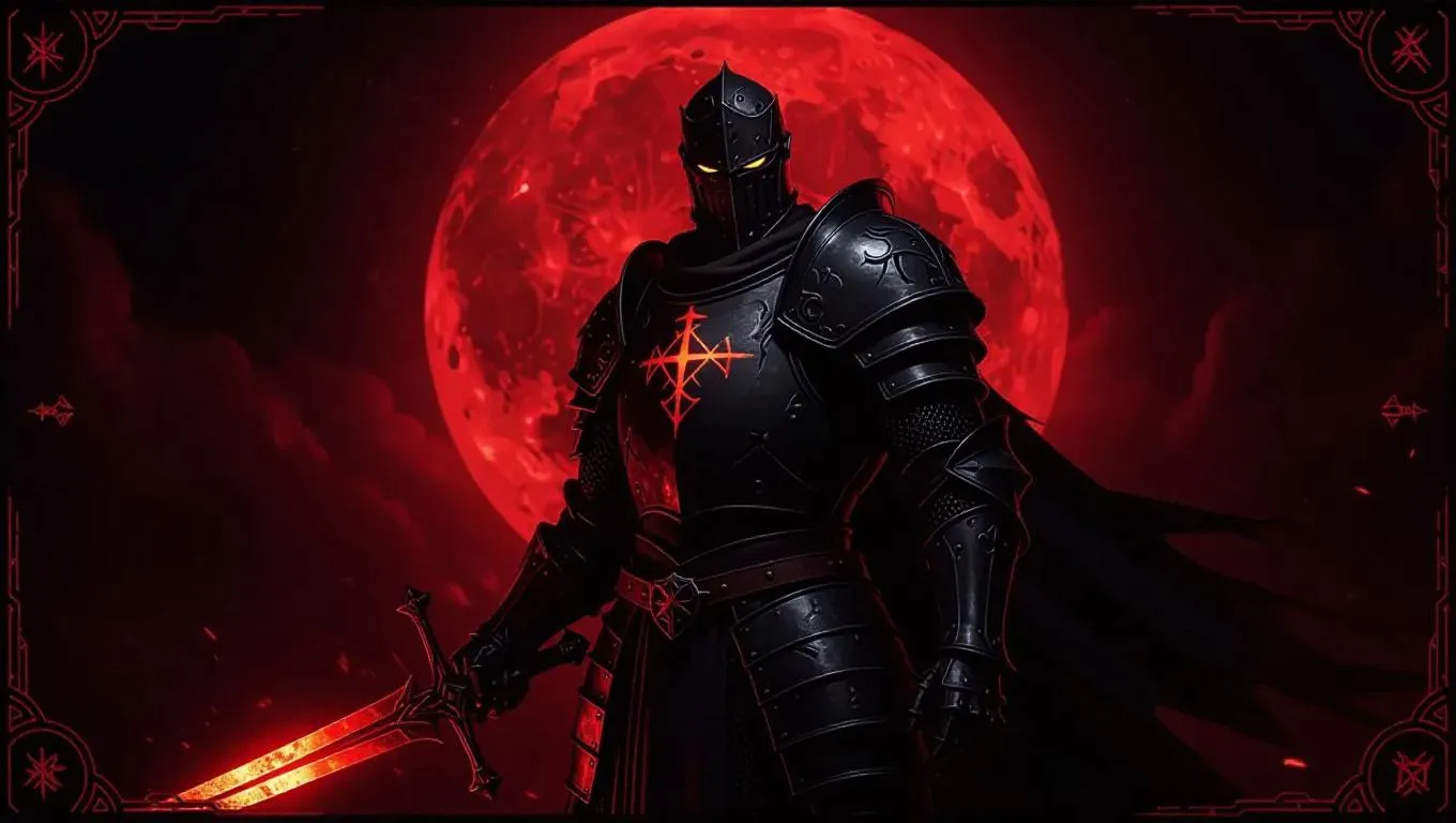 A corrupted knight stands under a blood moon, his rusted armor and cursed black sword reflecting the eerie glow. His single glowing yellow eye pierces the darkness. The game card border features angular industrial shapes, deep black tones, blood runes, and a legendary metal-element mark with flickering glowing effects. Side light casts strong shadows, enhancing the knight's fierce presence. Style: Gothic horror.