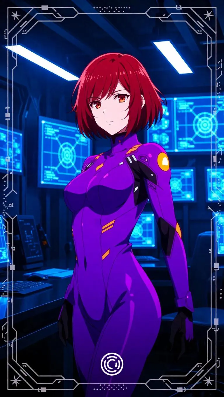 A futuristic anime-style female engineer, dressed in a vibrant purple outfit with glowing orange accents, stands in a powerful pose. Her shoulder-length frizzy red hair contrasts with her glowing orange eyes. The high-tech workshop behind her is filled with drones and augmented reality interfaces. The scene is framed by a sleek white border adorned with electronic patterns and a metallic texture.
