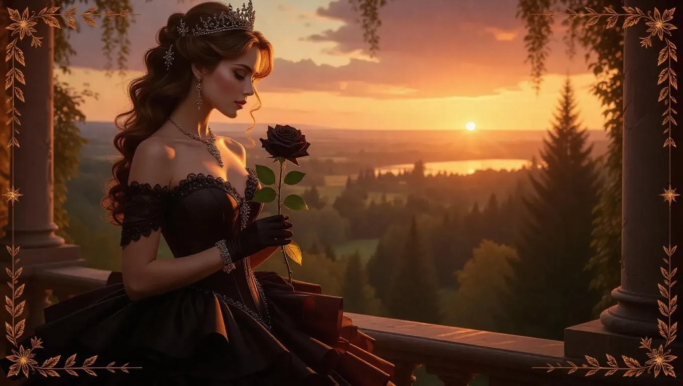 A mysterious queen with cascading chestnut hair, wearing a dramatic ball gown with layers, holds a black rose while standing on an elegant balcony overlooking a brilliant sunrise. The background showcases a whimsical, enchanted forest with radiant sprites. The card border features detailed leaf and star motifs, accented with olive and peach decorations, and adorned with sparkling garnets.