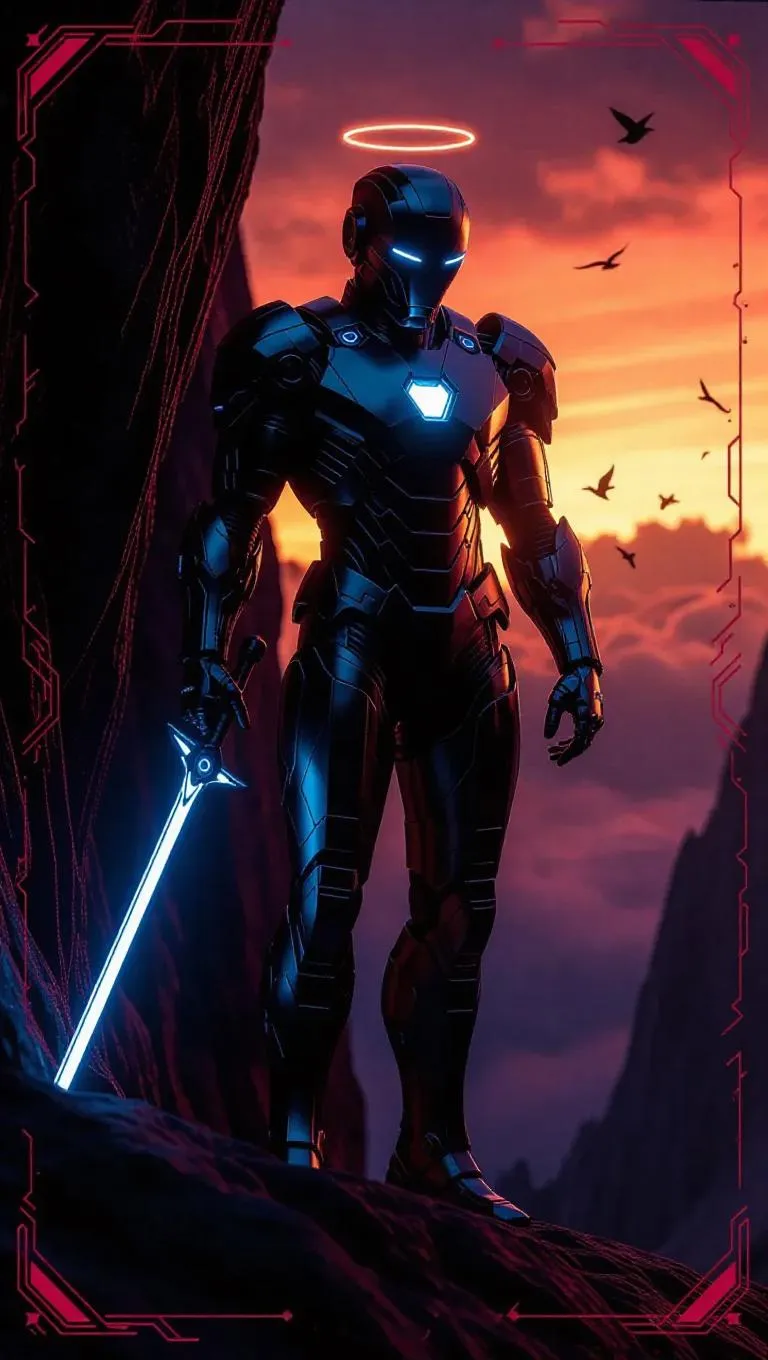A futuristic cyber-paladin stands in sleek chrome armor against a steep cliffside. He wields a glowing plasma blade and wears a halo of illuminated circuits. The scene is set under a dramatic sunset, with clouds and birds casting vibrant hues. Soft side light enhances the metallic sheen of his armor, creating a balance of highlights and shadows. The card border features angular sci-fi patterns with a crimson-and-silver shine, adorned with mecha emblems. Style: Cyberpunk.