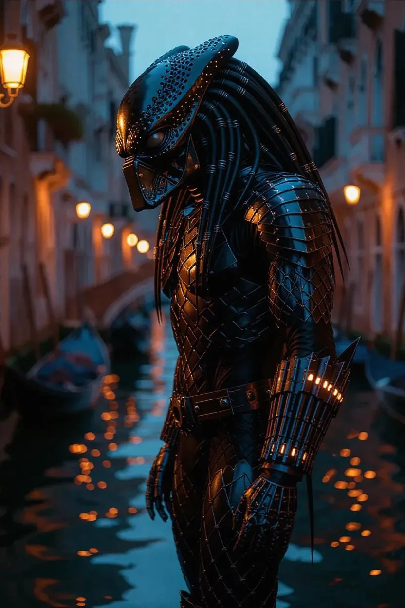 A lone bio-mechanical Predator in burnished copper-brass armor stands and steers a starlit cosmic canal through a Venice city. Hyper-realistic, psychedelic, eviscerated fractal patterns, bad acid transmogrification, creative DMT, unsettling horror-core aesthetic, intricate and detailed, vibrant and otherworldly colors.