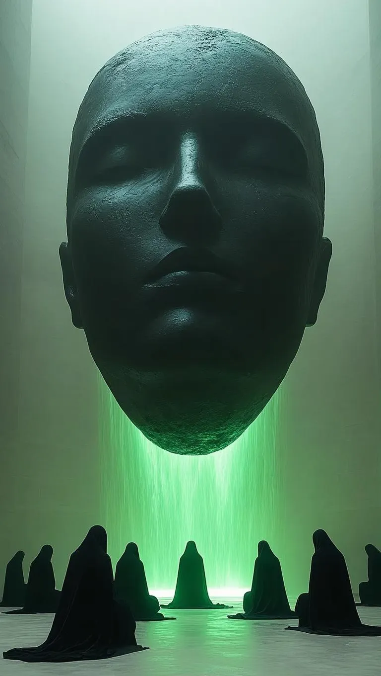 Surreal AI-generated imagery of a floating giant head sculpture, cloaked figures kneel as green soul light ascends. Minimalist black and green palette merges mystical worship with abstract art. Explore AI-powered surrealism, ethereal visuals, and symbolic storytelling through cutting-edge image generation.