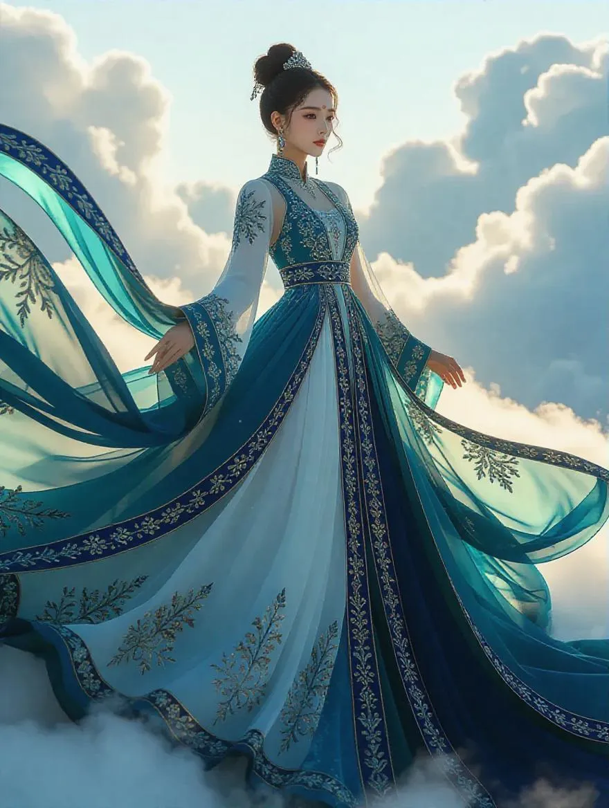 Royal outfit for Air El, adorned with intricate embroidery and flowing fabrics, featuring a harmonious white, sky-blue, dark-blue, and blue-green color palette, set against a backdrop of ethereal clouds and shimmering light.
