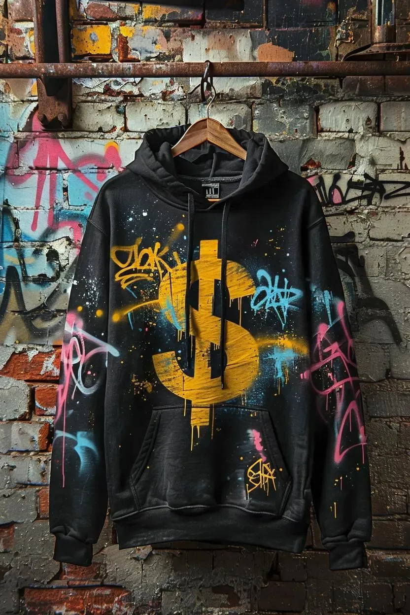 Generate a hyperrealistic black hoodie featuring a graffiti-style dollar design, hanging on a clothes hanger. AI-generated image with vivid textures, precise details, and lifelike realism. Perfect for streetwear art, contemporary fashion, or high-resolution promotional visuals. Create professional-grade content with VivaGo AI.