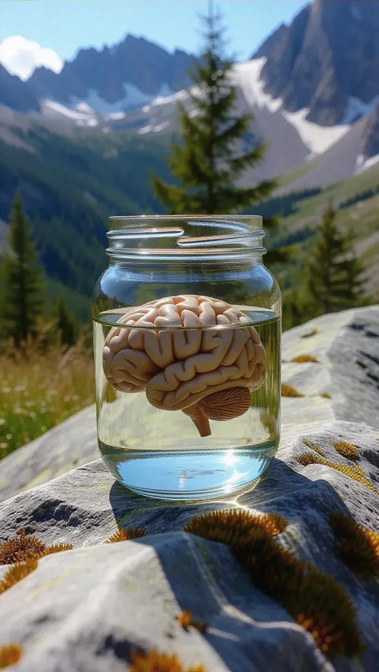 Create a surreal AI-generated image of a moss-covered human brain preserved in a water-filled jar, perched on sunlit mountain rocks. Explore hyper-realistic details, organic textures, and ethereal atmosphere with AI tools. Perfect for sci-fi concepts, experimental biology visuals, or thought-provoking digital art blending nature and artificial preservation.