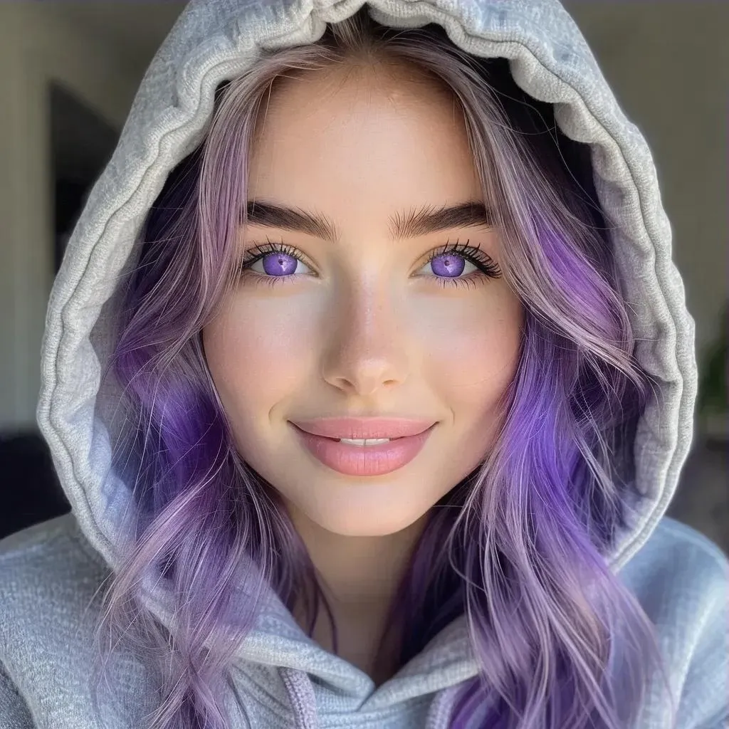 Generate sweet, innocent AI characters with vivid purple hair, captivating purple eyes, and warm smiles using vivago.ai. Craft ultra-HD visuals of hoodie-clad women, blending cute aesthetics with lifelike details like high nose bridges for charming, high-quality digital art or personalized avatar creation.