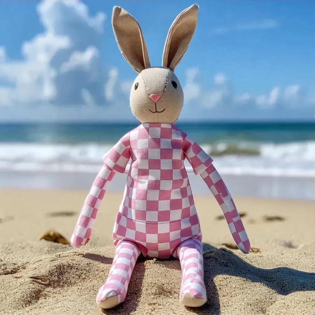 Adorable fabric rabbit toy with long legs, posing on a sunlit beach in a bold dark pink and white chessboard print t-shirt. Perfect for whimsical AI-generated visuals, blending playful character design, beach aesthetics, and retro-inspired patterns. Ideal for toy photography, children's content, or quirky AI art projects.