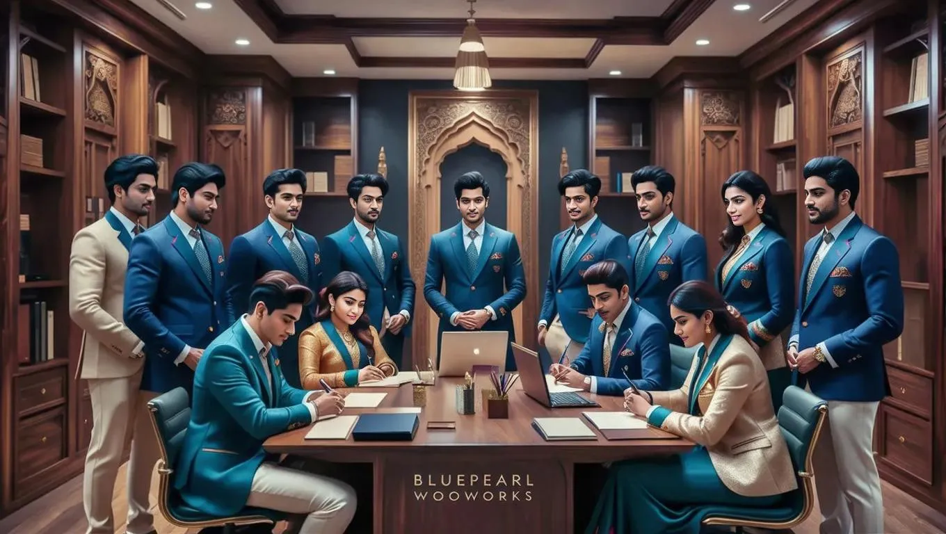 Generate AI-powered visuals of Bluepearl Woodworks' realistic office with 10 male & 10 female designers in branded blue blazers. Elevate corporate branding through professional interior design imagery, modern workspace aesthetics, and collaborative team dynamics using AI creativity tools.