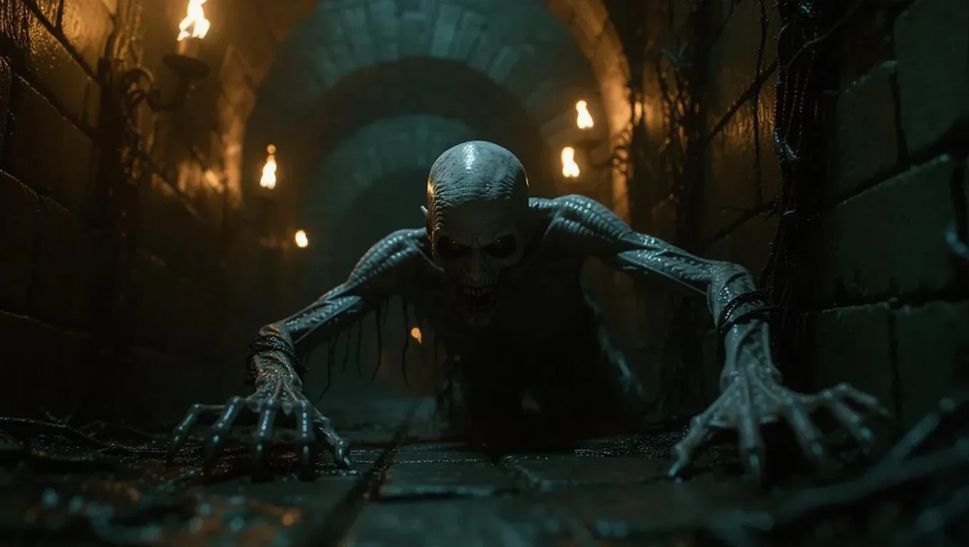 A grotesque, pale-skinned creature, reminiscent of the Pale Man, slithers through a dimly lit, dungeon-like labyrinth, its long, spindly fingers grasping for scattered, ancient artifacts as the walls seem to writhe and twist around it, covered in gnarled, thorny vines and festering, pulsing wounds, while eerie, flickering torches cast an unsettling, warm glow, bathing the scene in an atmosphere of foreboding dread, shot in a slow, crawling, Dutch angle close-up.