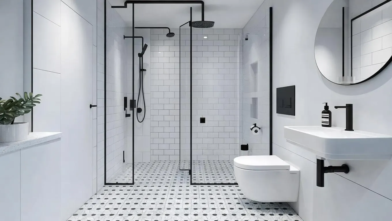 Transform your narrow bathroom into a sleek, functional space with AI-generated designs. Optimize layouts featuring white hexagon floor tiles, white walls, and space-saving fixtures like a wall-mounted sink, toilet, and a compact shower. Perfect for modern small bathrooms—explore AI tools to visualize and create efficient, stylish solutions tailored to your spatial needs.