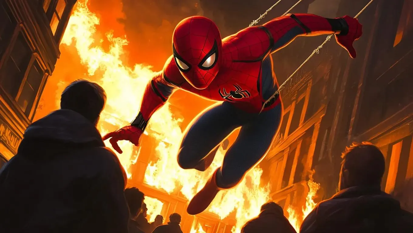 Generate an AI-powered Spider-Man rescue scene with flames, smoke, and dramatic lighting. Transform text into high-detail visuals using vivago.ai's creative tools for dynamic superhero action, intense atmospheres, and professional-grade video effects. Ideal for immersive storytelling and heroic AI-generated content.