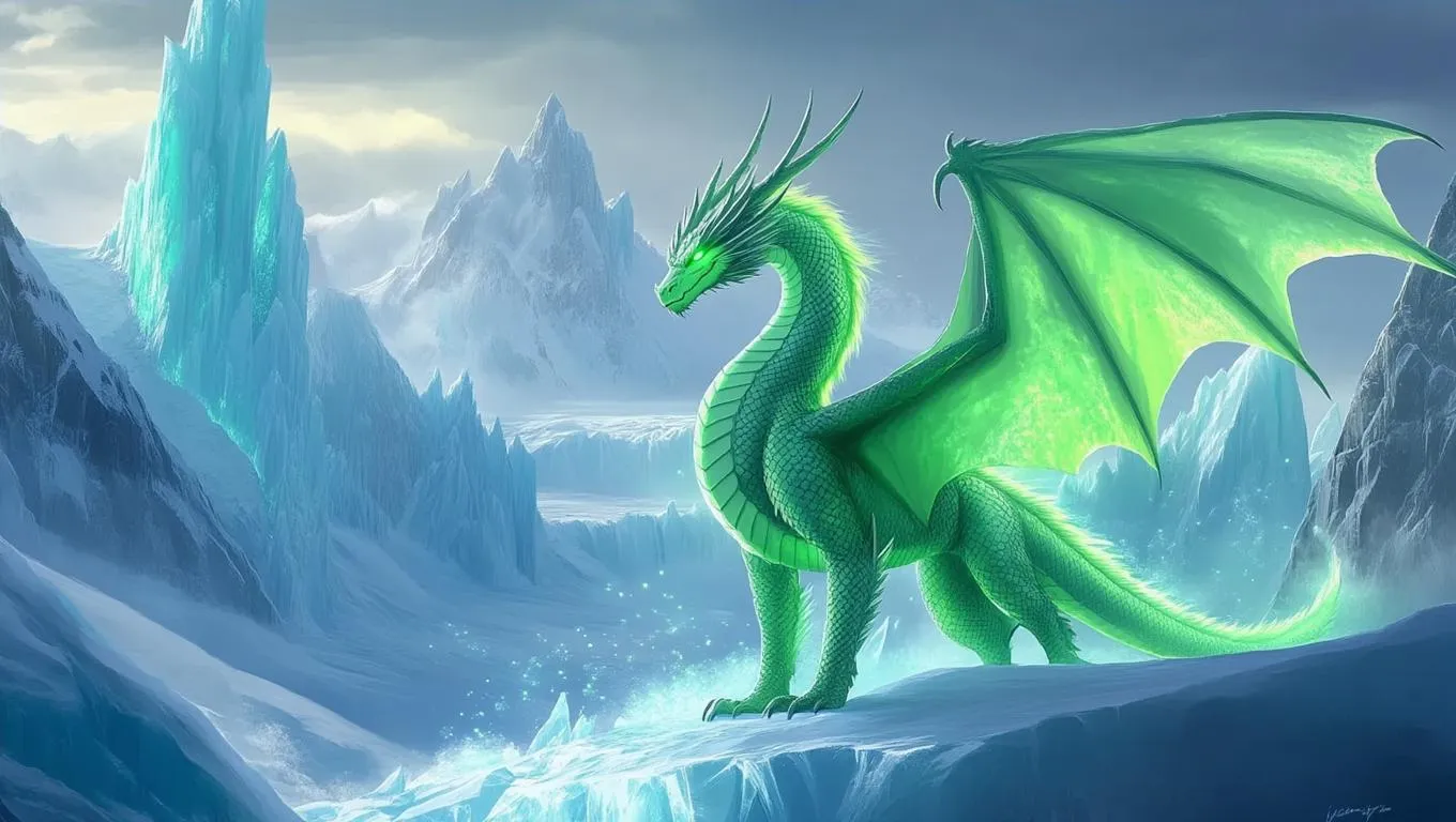 Create a majestic fluorescent green ice dragon surrounded by ice dust amidst gigantic glaciers. Inspire strength, calm, and nobility with AI-generated mythical art. Transform your vision into striking visuals using advanced AI tools for professional-grade, imaginative results.