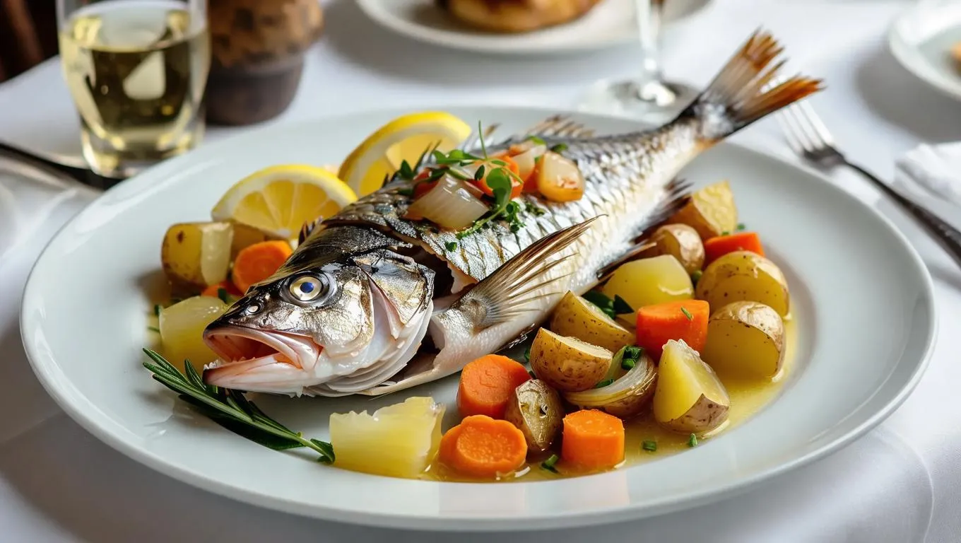 Create vibrant AI visuals of a gourmet stuffed fish with roasted potatoes, carrots, onions, lemon, and orange garnish. Perfect for food bloggers and chefs seeking AI-generated recipe imagery, culinary content, or AI-enhanced food photography for menus, ads, or social media posts. Elevate your seafood dish presentations with professional AI creativity.