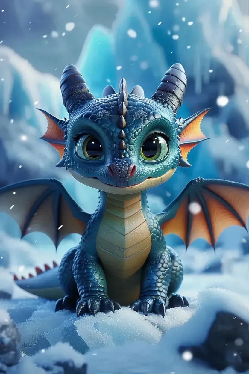 Create a lovable winter dragon baby with kawaii charm in Pixar-style CGI. AI-generated ultra-detailed design features frosty scales, glowing eyes, and glacial habitat backdrop. Perfect for fantasy art fans seeking realistic, whimsical creature illustrations with ice crystal details and lifelike textures.