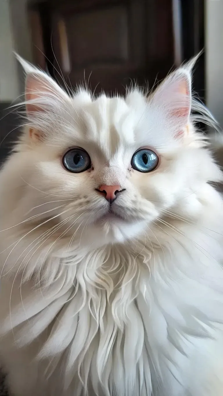 Generate a stunning AI image of a fluffy white cat facing the camera, showcasing mesmerizing blue eyes and a cute smile. Utilize advanced AI effects and text-to-image tools for professional-grade, lifelike results. Create captivating visuals with Vivago.ai's AI-powered creative platform.