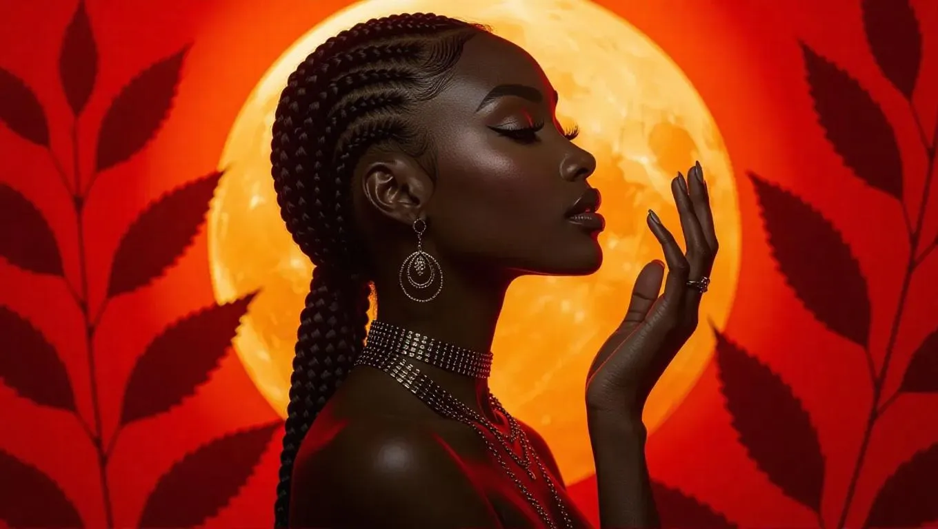 A Black woman with dark skin and long, braided hair in profile, positioned against a large, radiant orange sun. She wears multiple intricate necklaces and earrings, with her hand raised gracefully. The background features a gradient of deep red, adorned with silhouettes of delicate leaves and flowers, enhancing the serene and vibrant atmosphere.