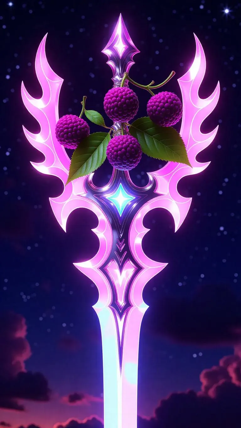 A glaive crafted from overlapping lychee segments, with a translucent, white core that emits a soft, celestial glow. The weapon has a futuristic, sleek design, set against a starry night sky that enhances its otherworldly beauty. The scene is bathed in neon, ambient light, with stars twinkling in the background. The style is fantastical, blending realism with ethereal elements.