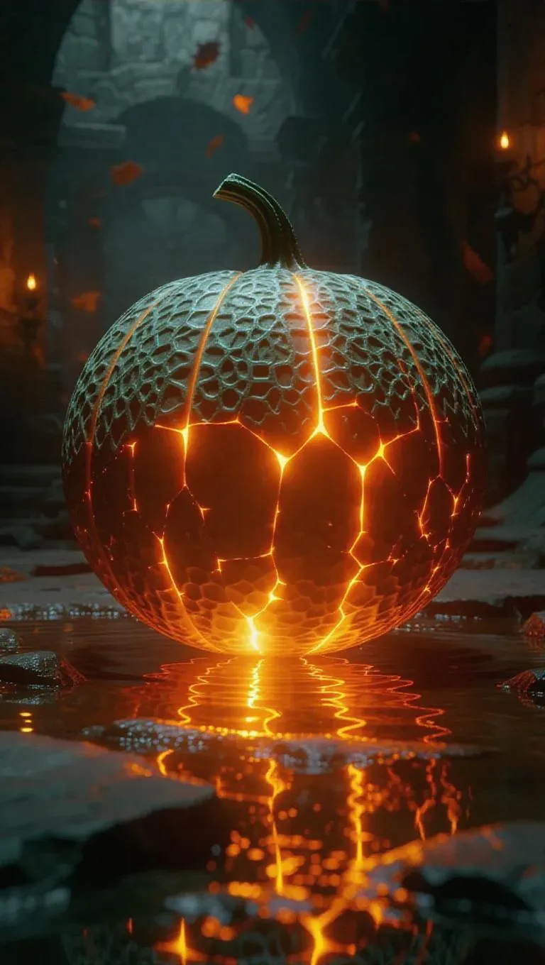 A melon mace with a splintered surface, glowing copper juice leaks from the fissures, casting an ethereal glow in the ancient ruins, surrounded by a halo of floating ancient scripts.