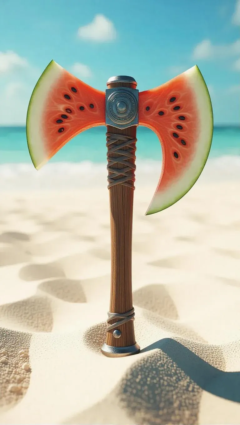 A battle axe forged from thick slices of watermelon, featuring a fiery orange core that crackles with energy, boasting a bold and powerful design, set against a sandy beach background that emphasizes its formidable strength.