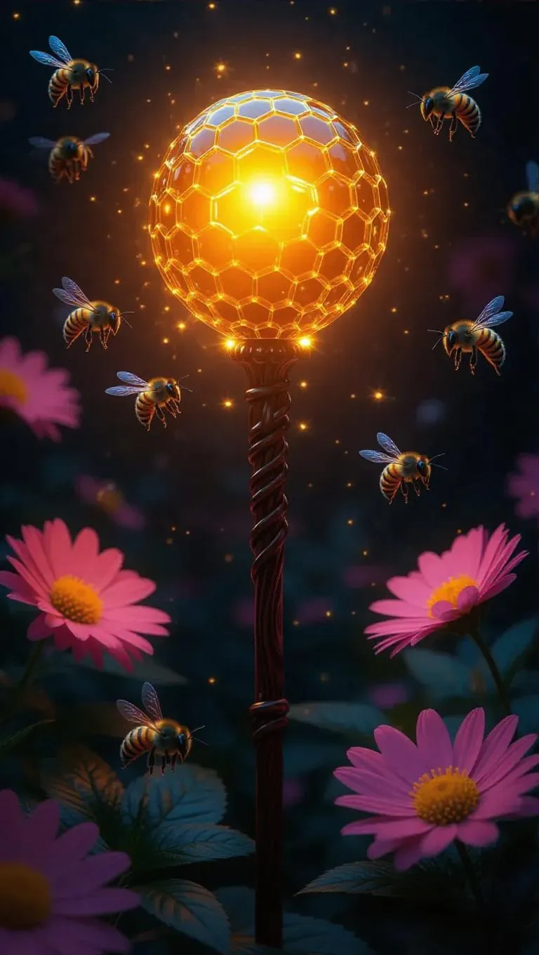 A magical wand with a honey core, emitting a trail of glowing honeycombs, glowing with a warm, sweet light, set against a playful backdrop of buzzing bees and vibrant blooms