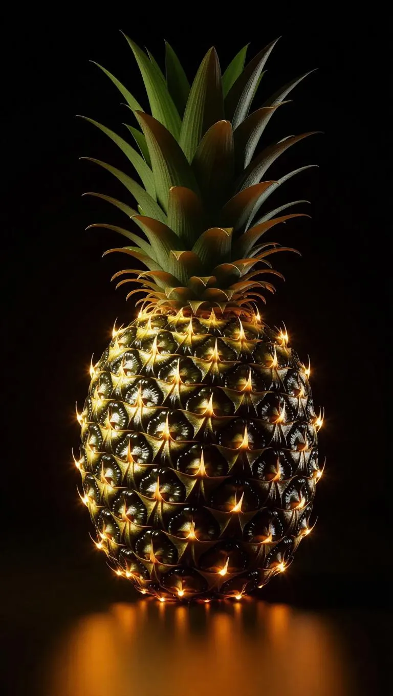 A grenade crafted from a pineapple, detailed texture with spiky leaves and rough skin, enveloped in a glowing golden energy aura, set against a dark background, emphasizing the surreal and vibrant nature of the fruit.