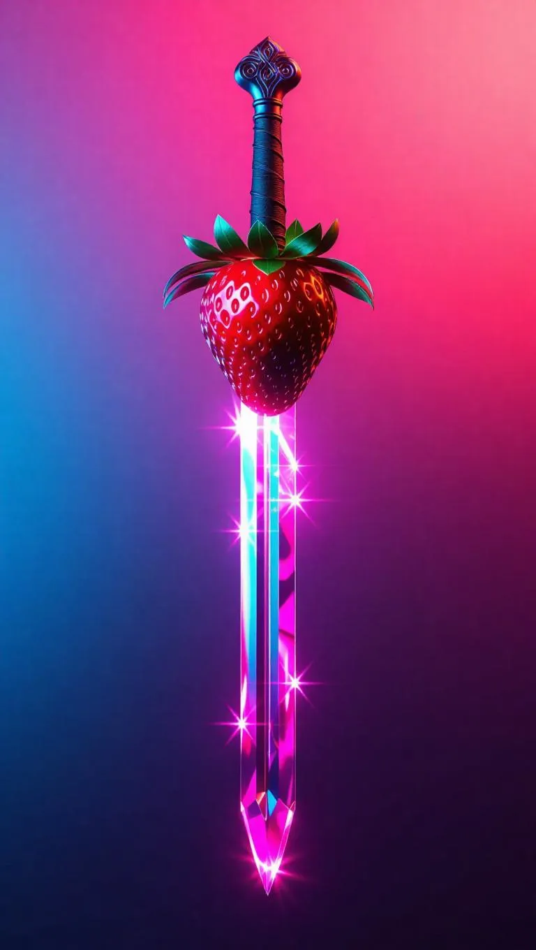 Strawberry sword with a crystal-like blade, glowing aura effects, minimalist design, sleek and modern, set against an abstract gradient background, emphasizing the weapon's elegance and otherworldly presence.