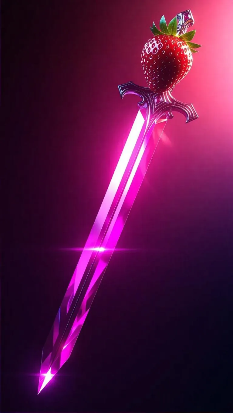 Strawberry sword with a crystal-like blade, glowing aura effects, minimalist design, sleek and modern, set against a subtle gradient background, emphasizing the weapon's elegance and otherworldly presence.