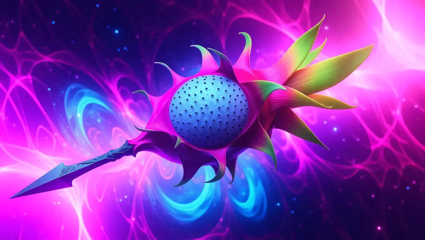 Spear with dragonfruit head, abstract cosmic style, swirling patterns, glowing energy, rich colors, interstellar glow, ornate designs, cosmic vibe, modern elements, enchanting atmosphere