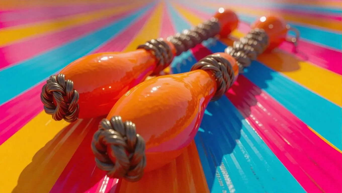 A pair of nunchucks crafted from vibrant, glossy oranges, connected by a coarse, woven straw chain, set against a bright carnival backdrop, exuding a blend of whimsy and precision, perfect for concept art.
