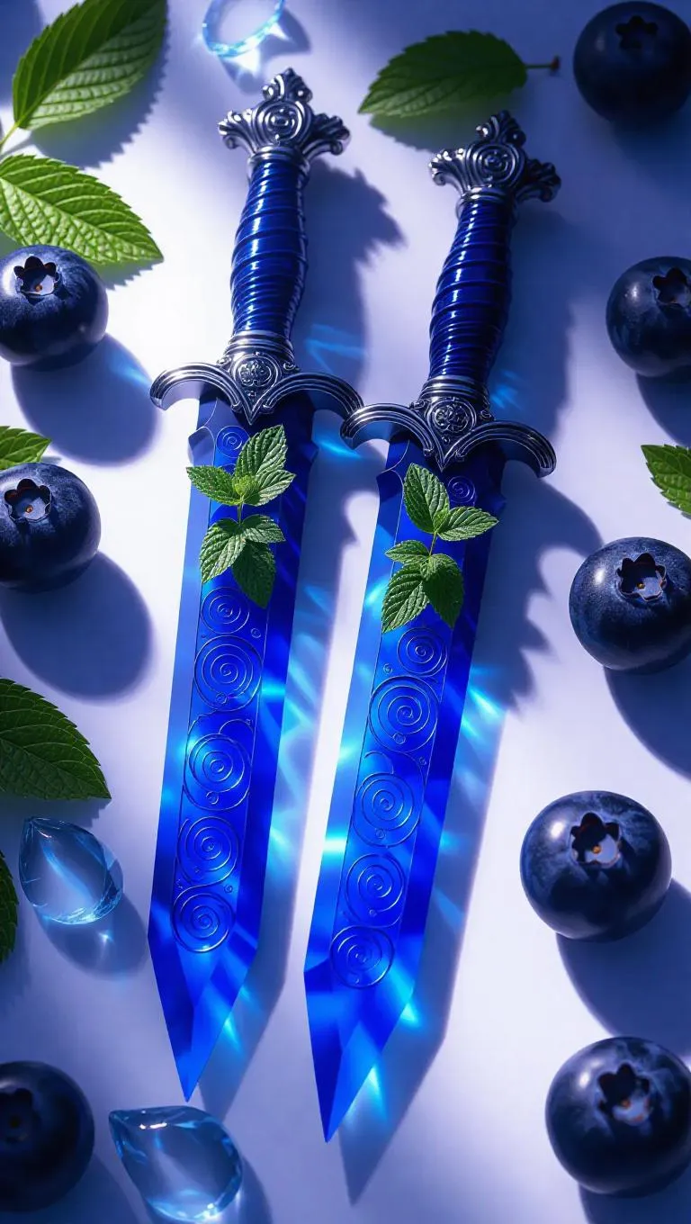 Dual daggers inspired by blueberries and mint leaves, floating composition, intricate blade designs with swirling blueberry patterns and mint leaf engravings, ethereal glow, set against a soft, dreamy background with subtle hints of nature.