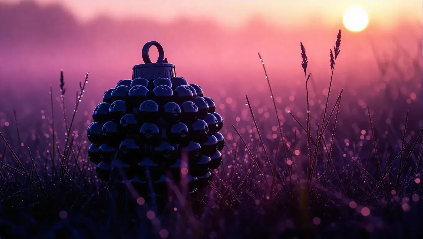 A grenade made from clusters of dark blackberries, deep black and shimmering in the light, rests against a misty meadow at dawn. The meadow's dew-covered grass and soft pastel colors of morning highlight the grenade's elegant yet explosive design. Gentle, misty light envelops the scene, casting soft shadows and enhancing the blackberry grenade's dark color. The image style is ethereal, capturing the intricate details of the blackberries and the serene beauty of the meadow.