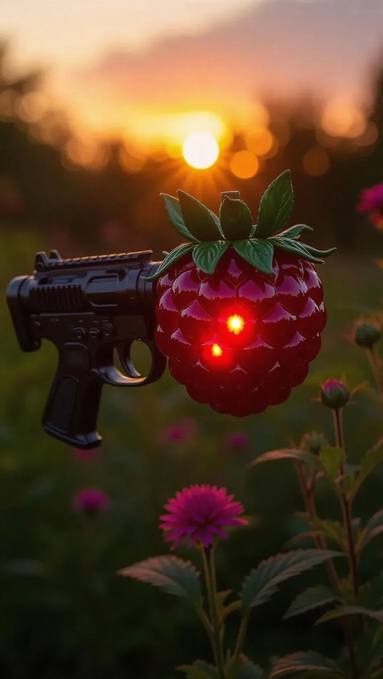 A grenade launcher intricately carved from a raspberry, featuring a bright red and green design that glows softly under the setting sun. Set against a delightful, sunset-lit garden, the weapon exudes a cheerful and inviting energy. The garden's vibrant plants and sunset sky enhance the surreal and vivid nature of the scene. Warm sunset light casts playful shadows, highlighting the weapon's unique texture and color. The style is a blend of realistic and fantastical elements, creating a visually striking image.
