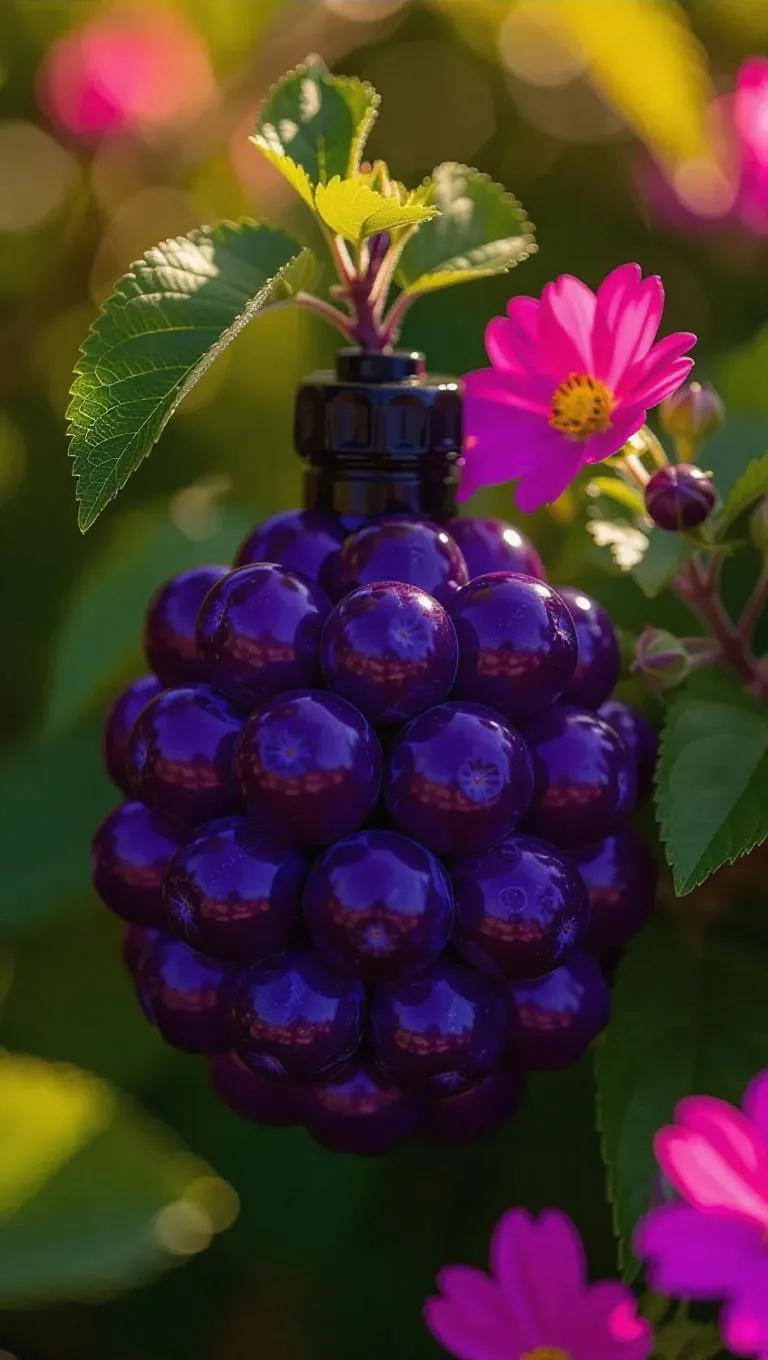 A grenade crafted from clusters of vibrant plums, deep purple and radiant in the sunlight, leans against a garden at midday. The garden's colorful flowers and bright green leaves highlight the grenade's elegant yet explosive design. Bright, cheerful light bathes the scene, casting lively shadows and enhancing the plum grenade's rich color. The image style is whimsical, capturing the intricate details of the plums and the joyful beauty of the garden.